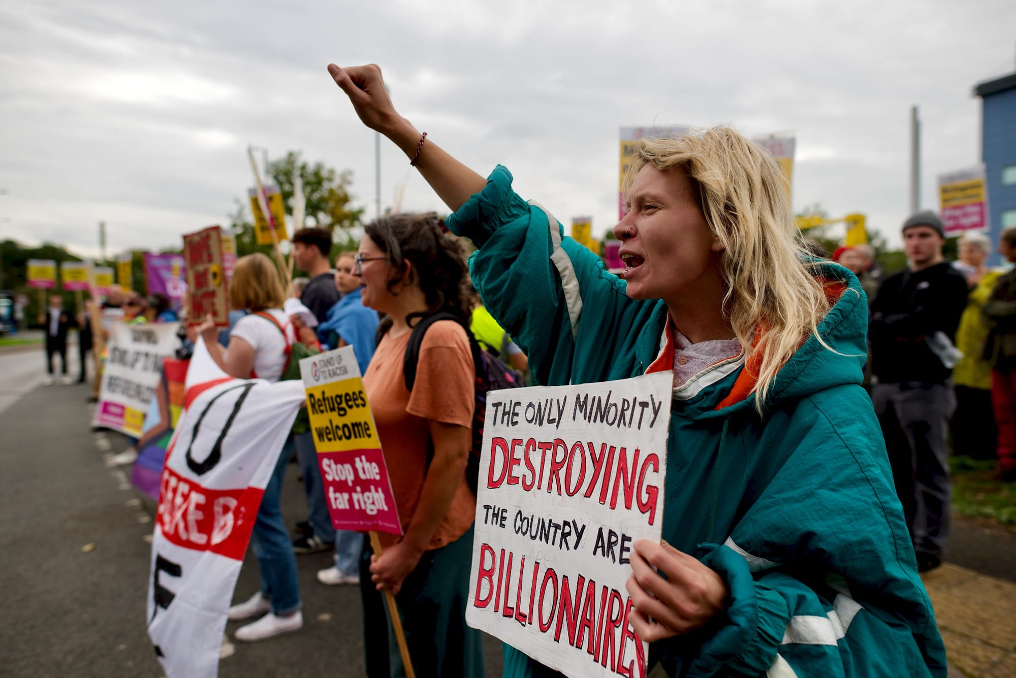 Demonstrators faced each other outside a hotel used to house asylum seekers in Oxford. Pro immigration protesters numbered around 100 and bore placards saying ‘Hope not Hate’, ‘Everyone is welcome here’ and ‘The only minority destroying the country are billionaires.’ Around 35 anti-immigration protesters waved St. George’s and Union flags, and held a minute’s silence for US activist Charlie Kirk.