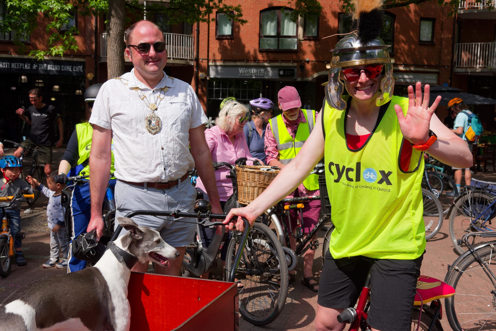 May Morning celebrations; Lord Mayor Mike Rowley and Councillor Anna Railton (plus whippet) attending Kidical Mass. (Photos by Roger Close.)