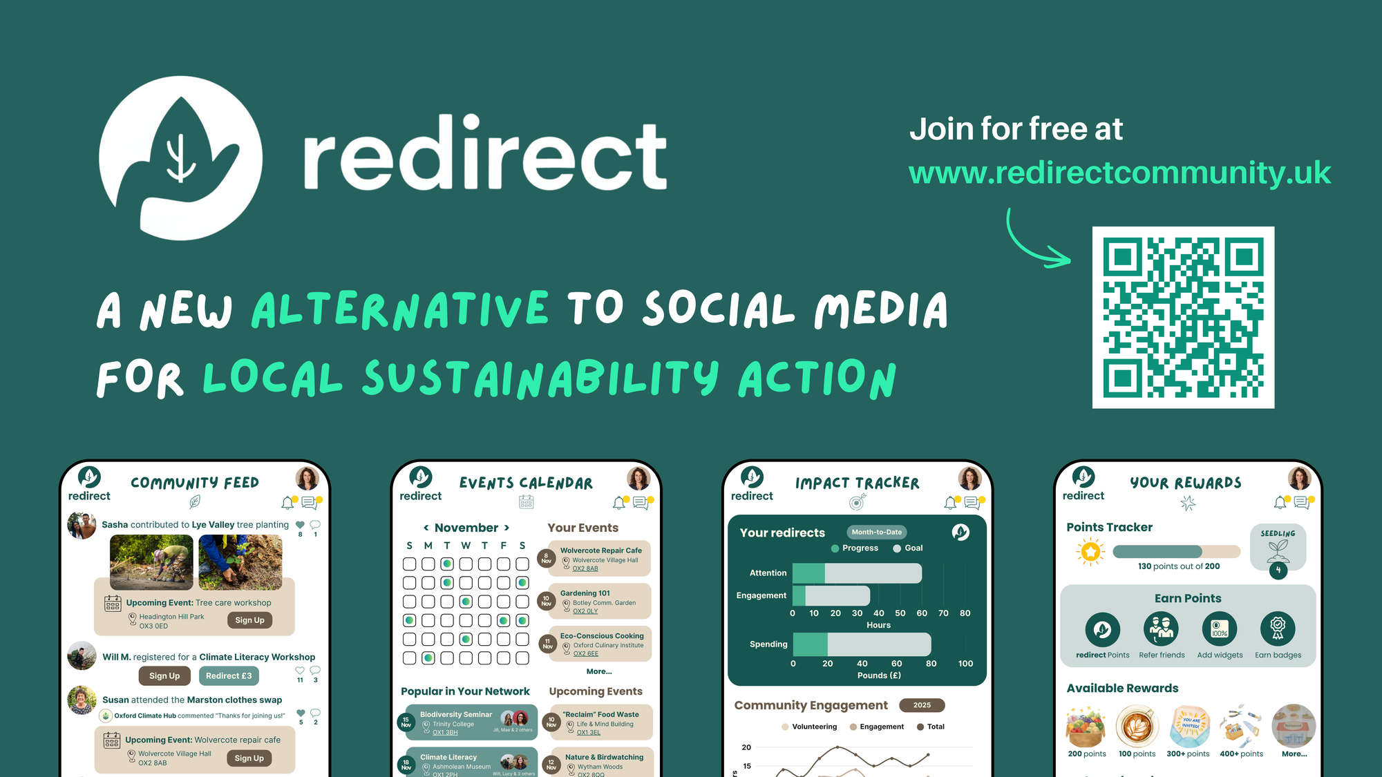 Redirect is currently piloting in Oxfordshire. It is a new type of "hyperlocal" social platform specifically for sustainability and climate action. Its creator and founder, Hannah Sassi, is an Oxford University researcher in sustainability and systems change.