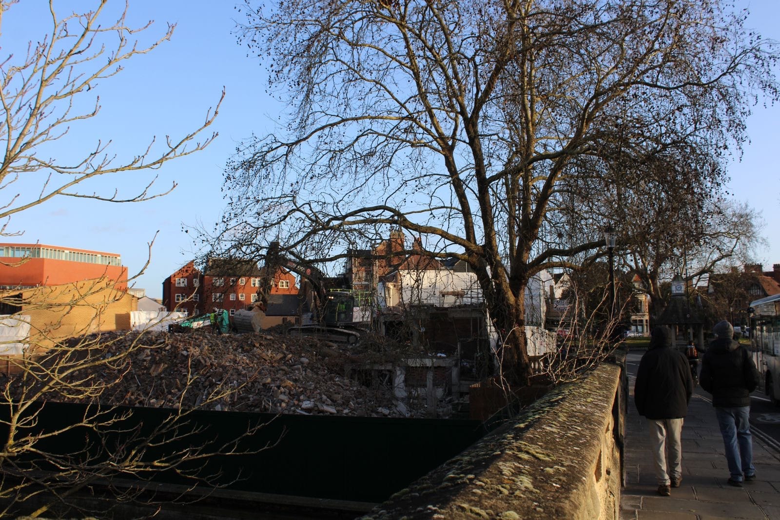 - The 1960s Waynflete Building has been demolished. Magdalen College is building replacement student accommodation on the site at The Plain. Rubble will be reused in the foundation of the new Waynflete Quad, named after the college's founder and due to open in 2028. A Clarion reader sent this view revealing the notorious Florey Building, the bright red accommodation block opened by the Queen's College in 1971. It is a Grade II* listed modernist building, but uninhabitable, and Queen's currently describes it as 'mothballed'.
