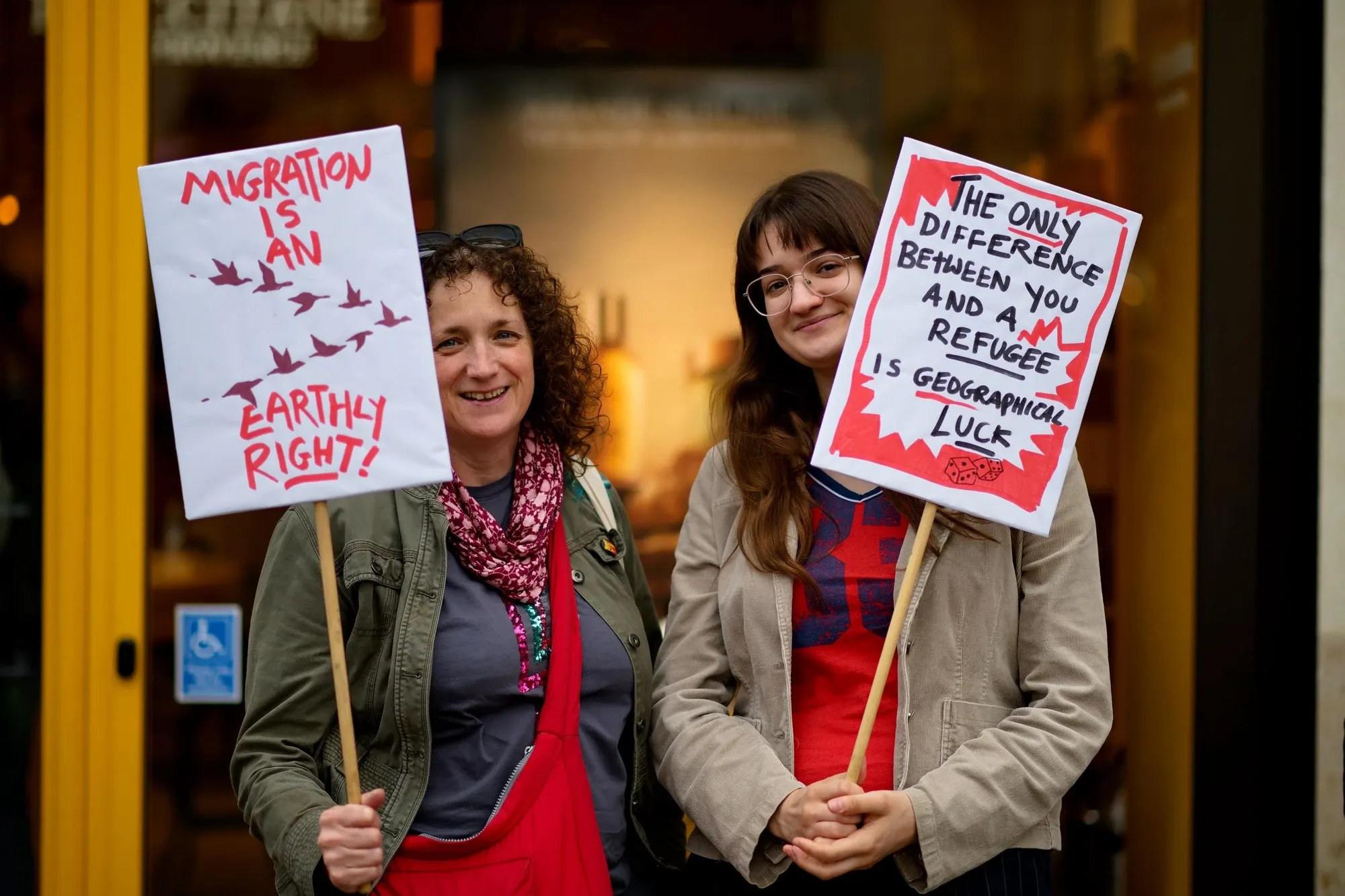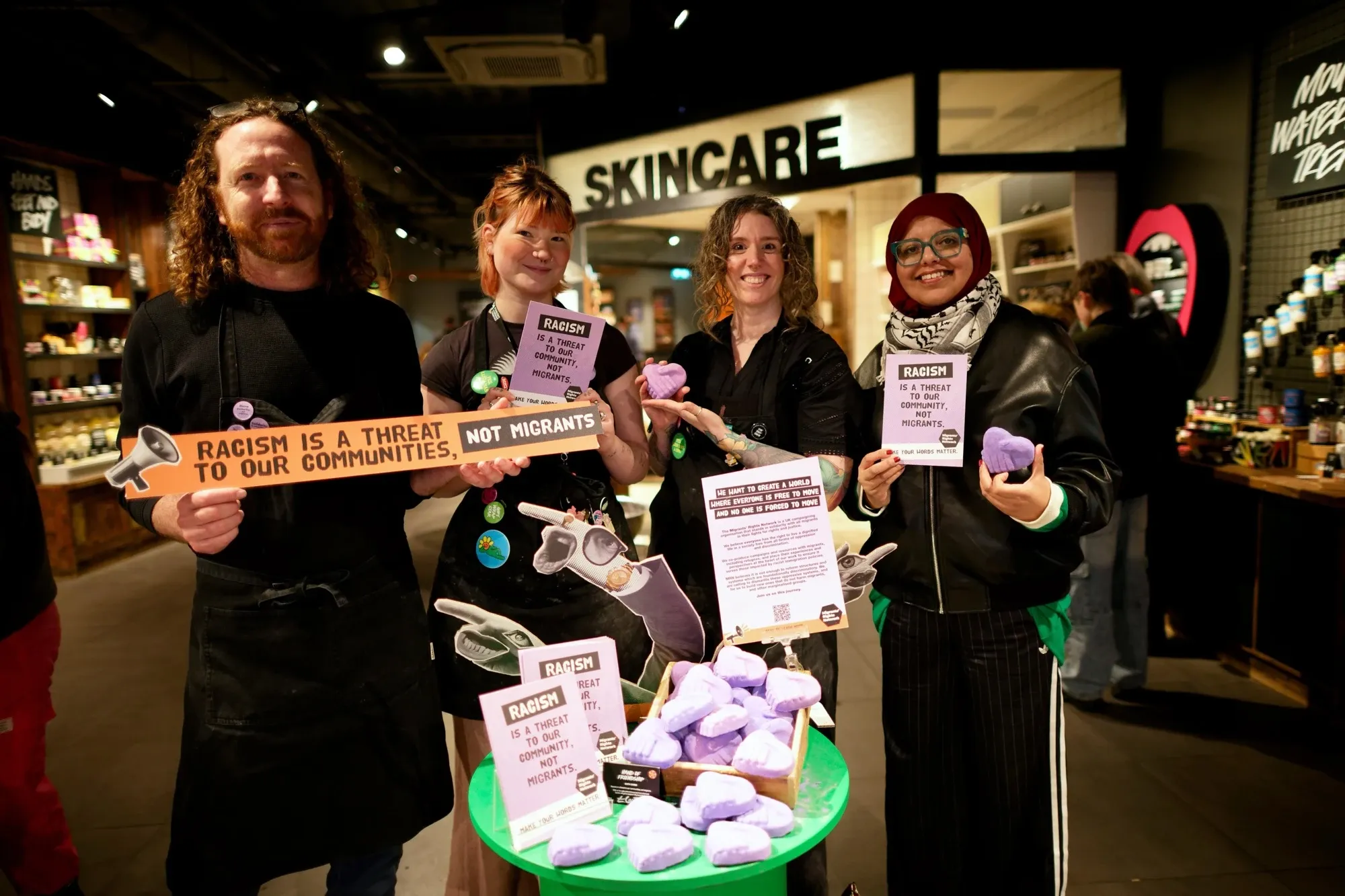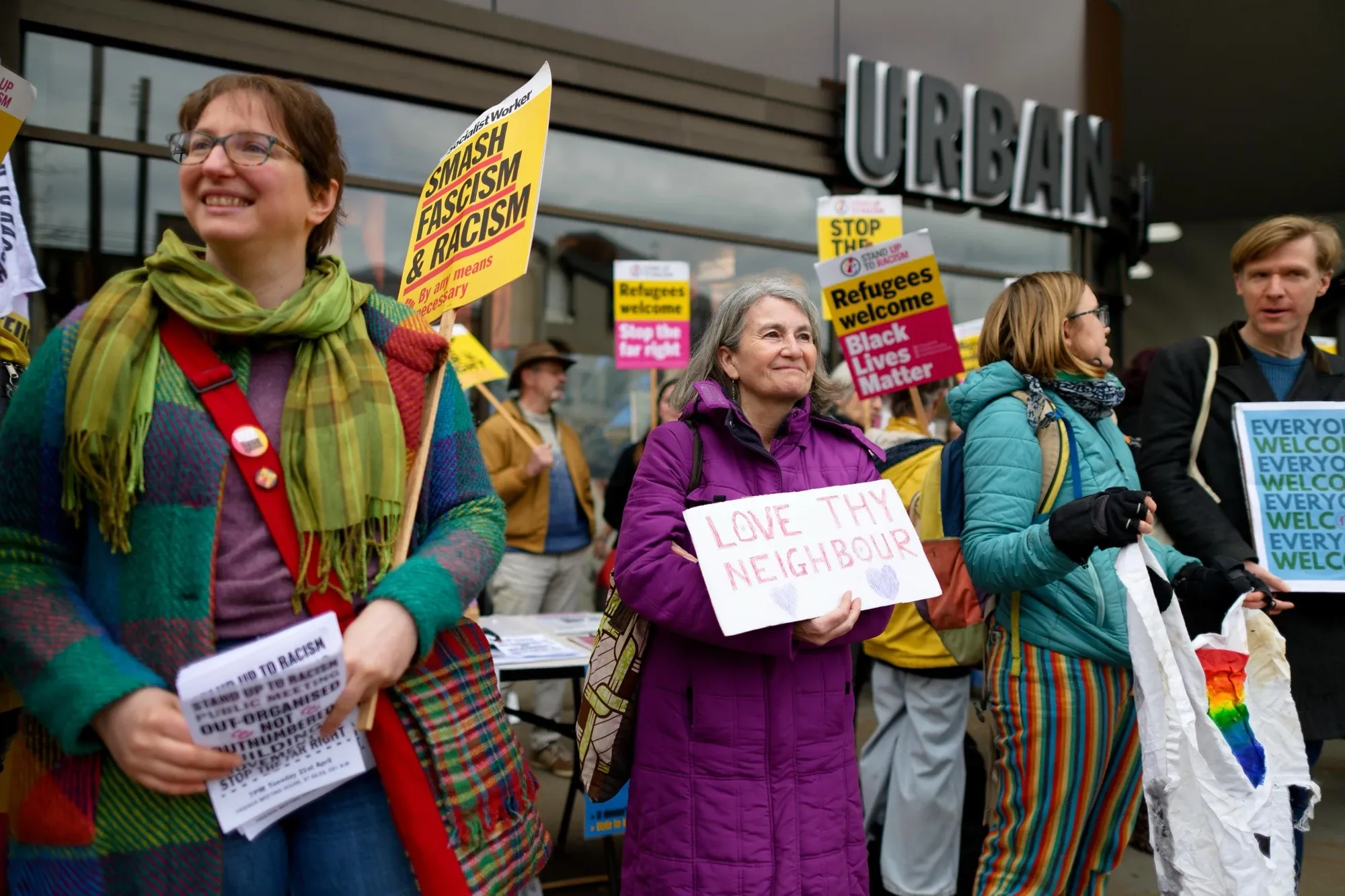 Then on Friday, Oxford residents gathered outside Lush in support of refugees and asylum seekers as a counter-protest to a planned demonstration from ‘the Oxfordshire Patriots’, who were four (4) in number. Signs included “the only difference between you and a refugee is geographical luck” and “love thy neighbour”.