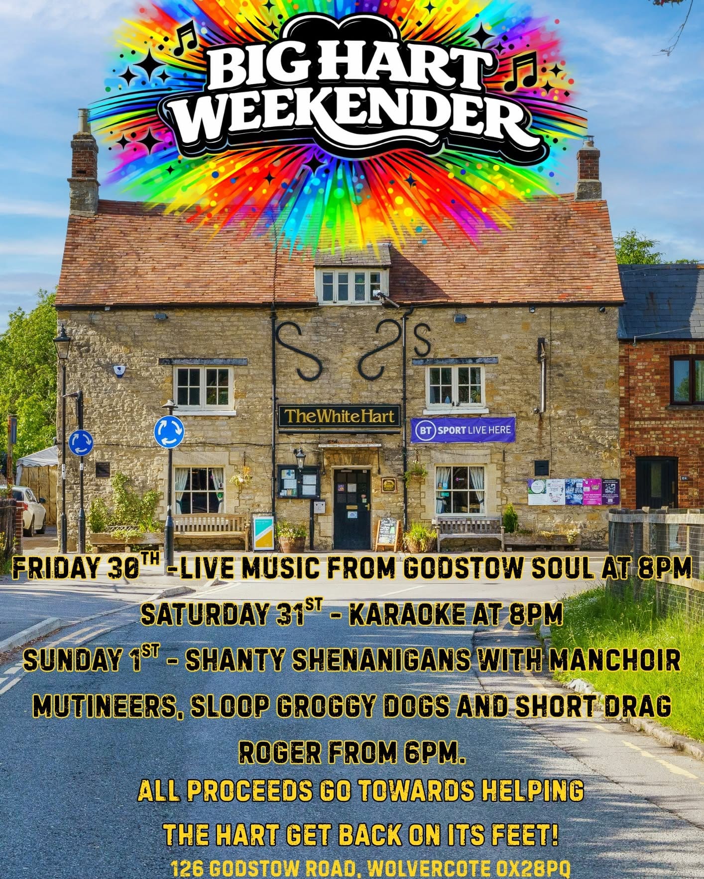 - Big Hart Weekender, Fri-Sun, The White Hart (Wolvercote). A weekend of soul, shanties, and karaoke to raise funds for the community pub following a burglary.