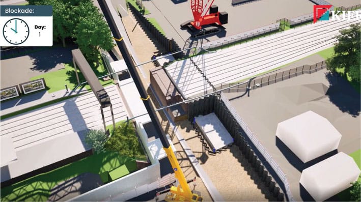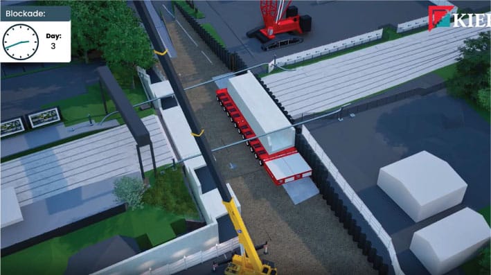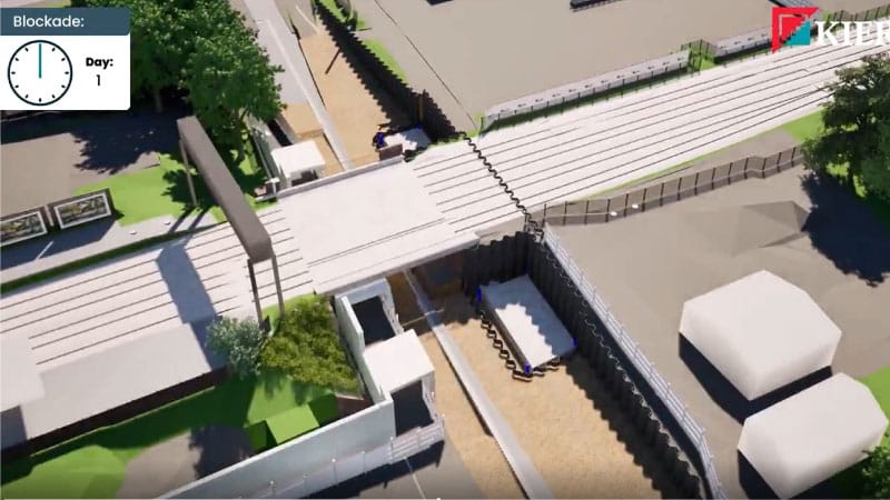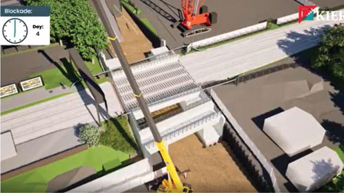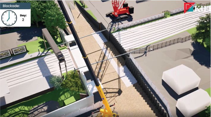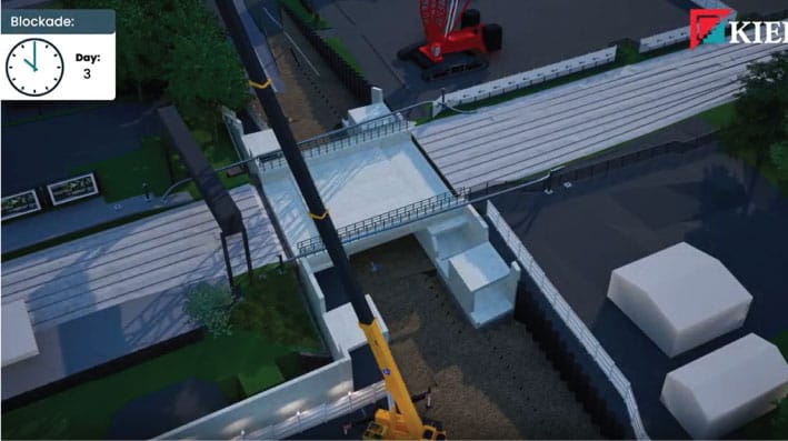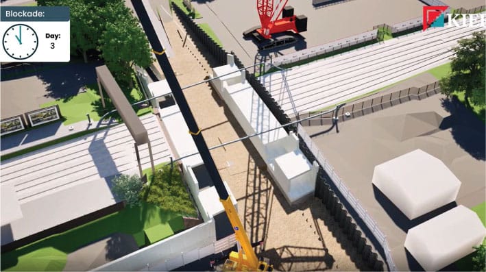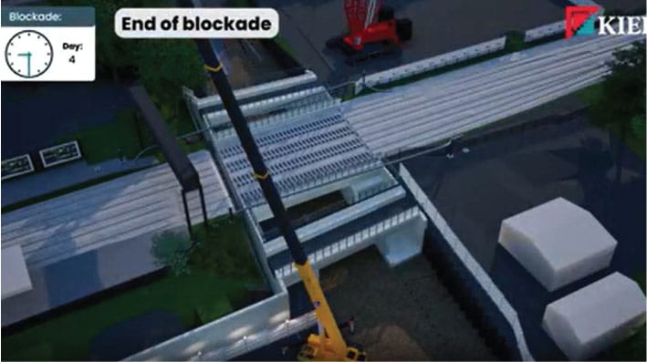 First, the railway tracks, the existing bridge deck, and the existing abutments will be removed. Then, using a special heavy load mover, the new north-side walkway will be moved into position. Abutment sections will be craned in on the east and west sides of this.