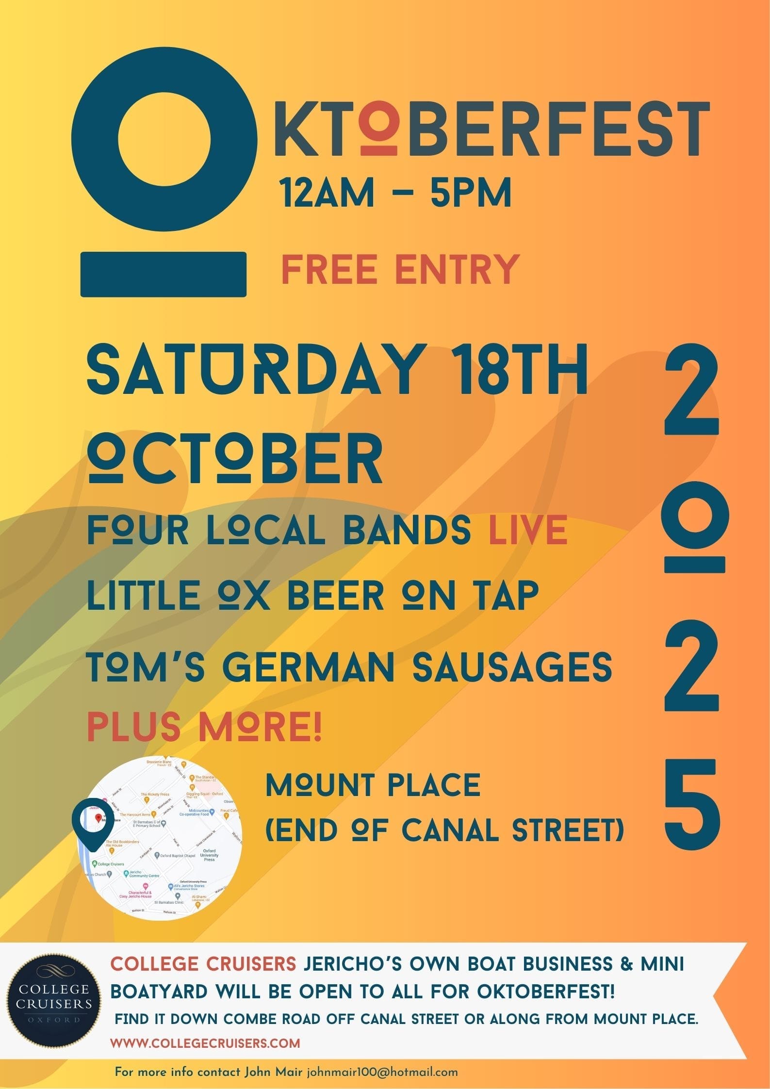 - Oktoberfest. Saturday, midday–5pm at College Cruisers, Mount Place, Canal Street, Jericho. Beer, bands, sausages. Who's in?