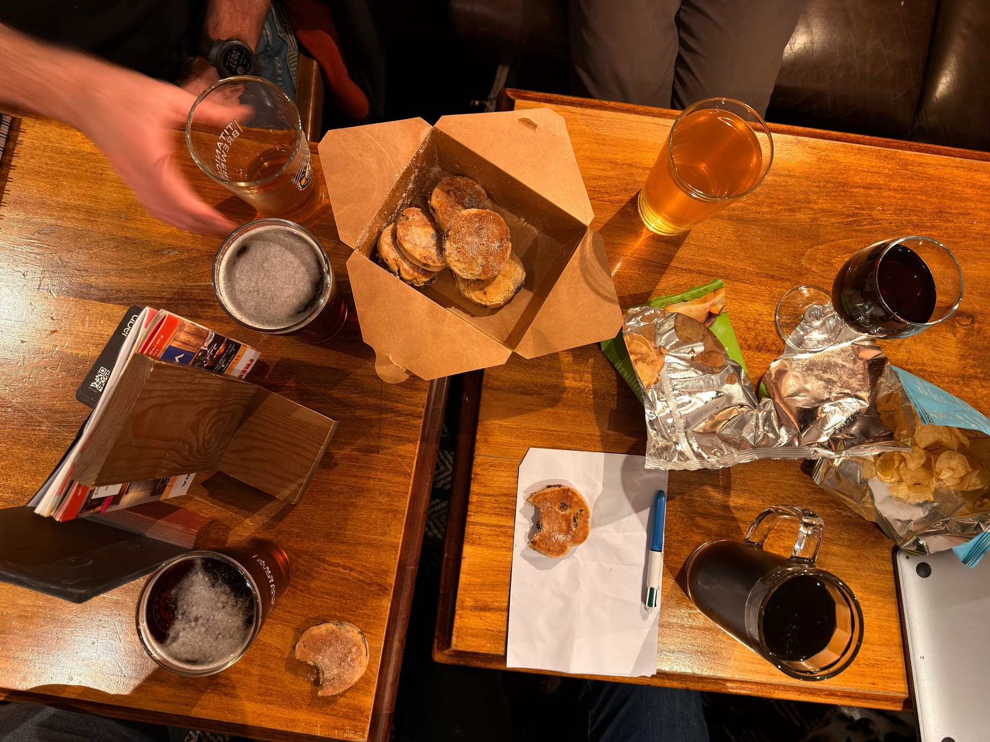 We now have so many writers we can't all fit on the same pub table; this is about half of our editorial meeting (with Welsh cakes). Our ability to be discreet is vanishing rapidly, so we can only hope people in the Royal Blenheim earlier this week weren't Clarion readers.
