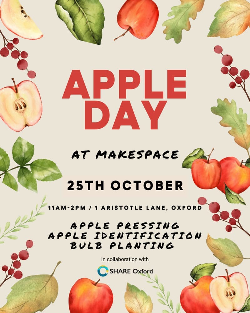 - Apple Day at Makespace. Sat 25 Oct, Aristotle Lane. Bring your own apples for identification or pressing.