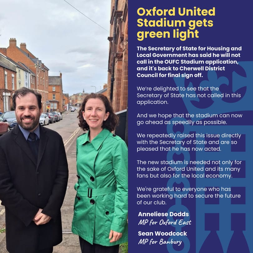 It’s all go for Oxford United’s new stadium at the Triangle, near Kidlington, as the Secretary of State Steve Reed confirmed he won’t “call it in”. This means the Government has forgone the chance to order a further review, which it could have done over Green Belt issues.
