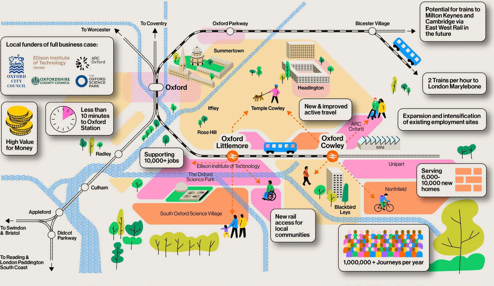 The funds will pay for the line – currently used only by freight trains to BMW’s Cowley plant – to be upgraded to full passenger standards, with new stations built at Littlemore and Cowley. The stations will be situated close to the fast-expanding Oxford Science Park, ARC Oxford, and Ellison Institute of Technology, with the latter alone planning to employ some 7,000 people.