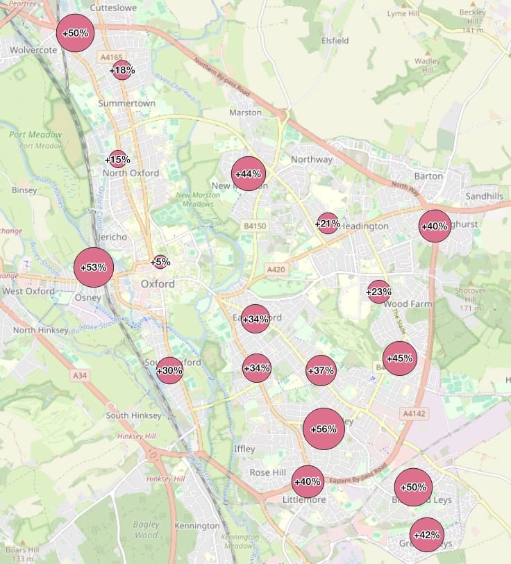 But since 2015, the trend has swung the other way. North Oxford and Headington prices have remained largely static. Prices near the Plain have slowed. The biggest rises have been further out, in Cowley and Blackbird Leys, as people are priced out of the centre – indeed, Cowley has gone from the smallest rise (30%) to the largest (56%).