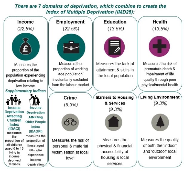 🔺 indicates more deprivation than 2015, ▽ indicates less deprivation. Neighbourhood names are Clarion approximations for illustration only and are not part of the source data. This infographic explains the constituent parts of the Index of Multiple Deprivation: