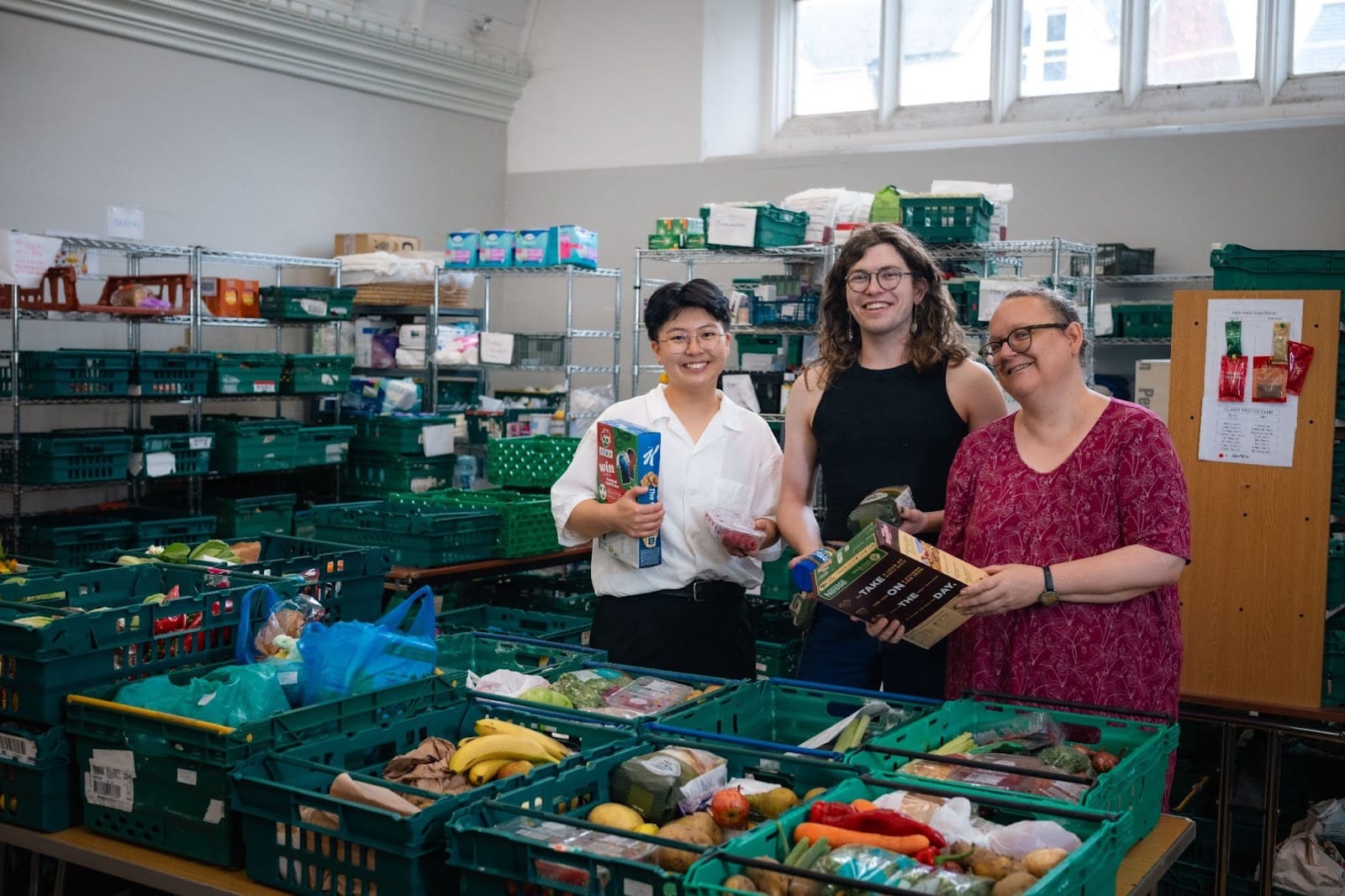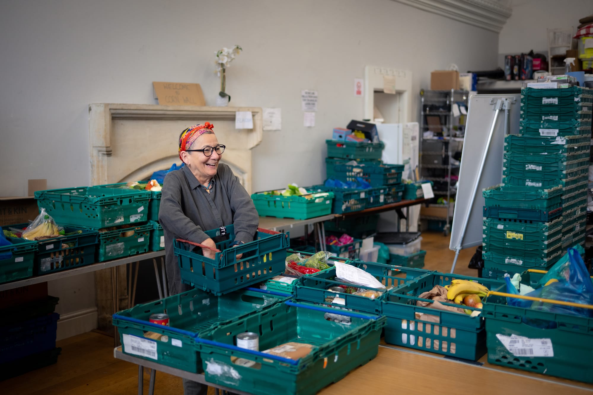 Meet Tom. He started volunteering at OMA because he “wanted to make a real, tangible difference in [his] local community” and his involvement whilst unemployed helped him “feel like you're part of something bigger”. Trio, packing up a box beside him, volunteers because she “loves the win-win of avoiding wasting surplus from the food retail process, and using it to feed people in food poverty”. Like many, Trio both receives parcels and volunteers in her own right.