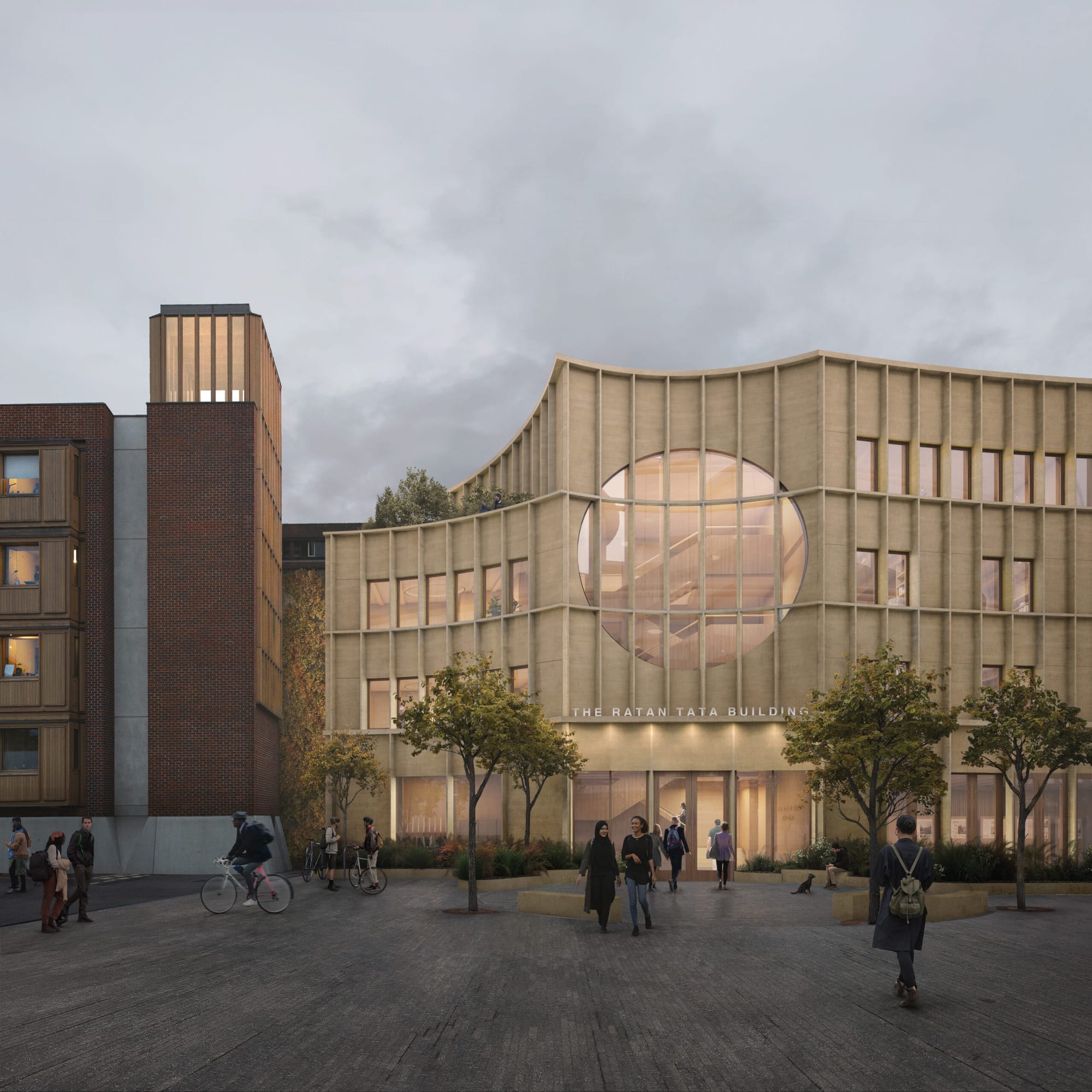 Ratan Tata (Wikimedia commons); an artist's impression of the Ratan Tata building at Somerville College.