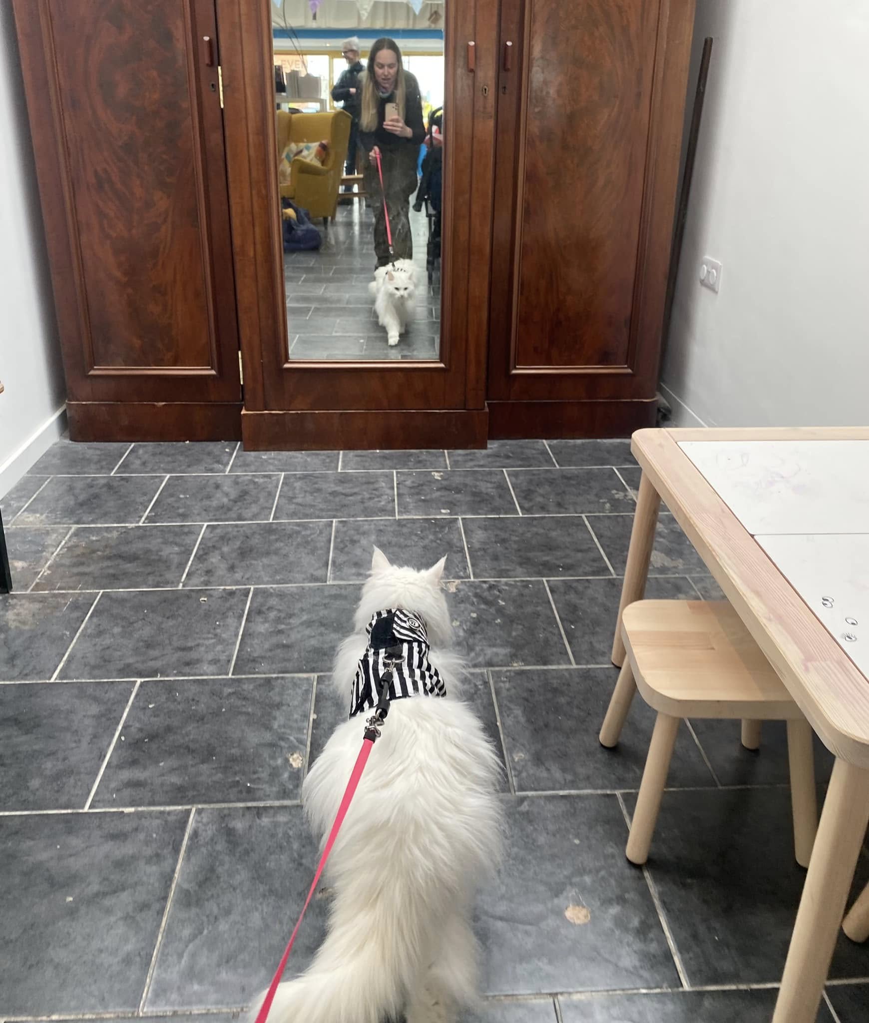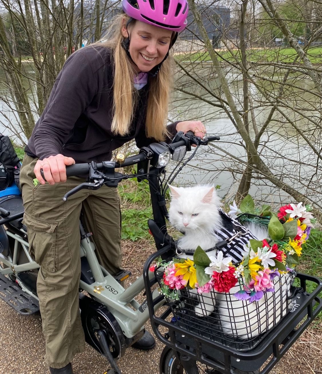 Emily Kerr does not have a cat, but she did bring world famous cycling influencer cat Sigrid (and her human Travis) to Oxford. This is their trip to Magdalen Road. She's the elected city councillor for St. Mary's, and County Councillor for Bartlemas. As champion for active travel, her advice if you wish to take your pet cycling is to use a cargo bike or trailer; you can use a front basket if you have a smaller pet, but you need to make sure your pet is secured to stop them jumping out. Pet carriers should come with their own clips but you can also use a carabiner. Use a harness, not a collar, as it provides more stability and prevents neck injuries. And get your pet used to it slowly.