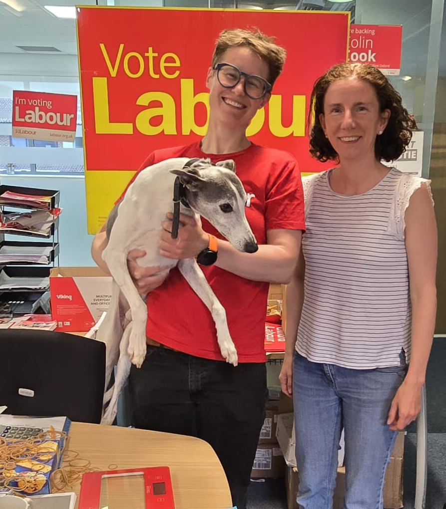 Anneliese Dodds has no dog, but in this photo Arthur the whippet, pet to Cllr Anna Railton (left), is making a visit to Labour’s Oxford East HQ. We think there must be a biscuit just out of shot. It is a campaign HQ. Of course there are biscuits.