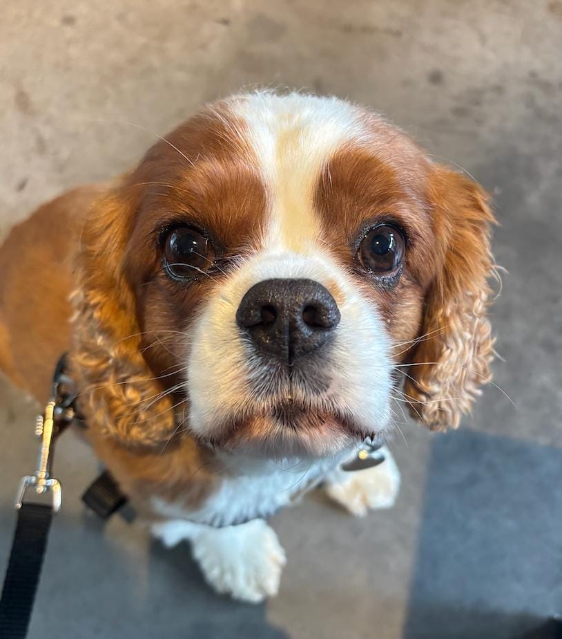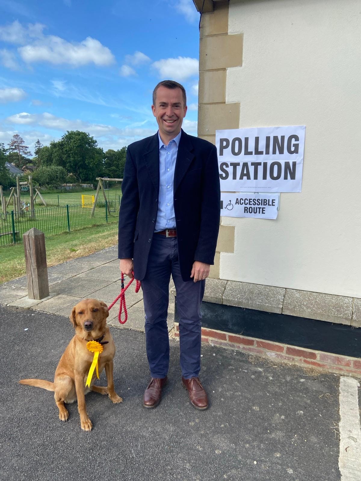 Calum has two dogs, Nutmeg and Arnie. Nutmeg is frequently in political photos as he (we presume?) is very good at posing, Arnie seen here getting a cuddle. Calum's launch campaign photo to be an MP back in 2024 starred Oscar the guide dog in a sea of orange diamonds. Please admire the perfect political posing. Mainly from the dog.