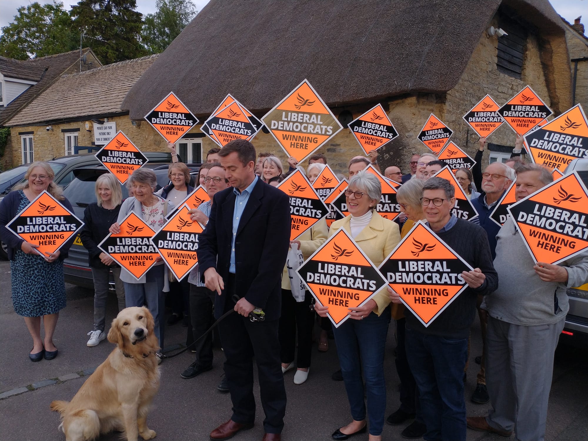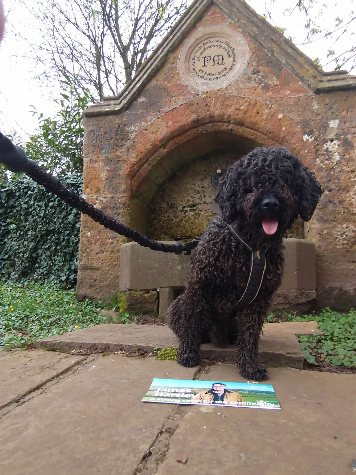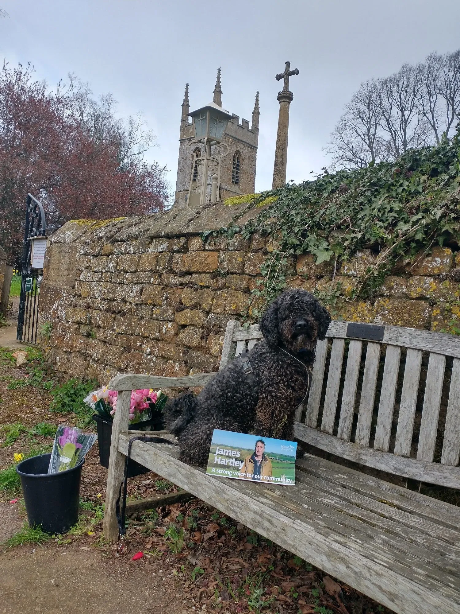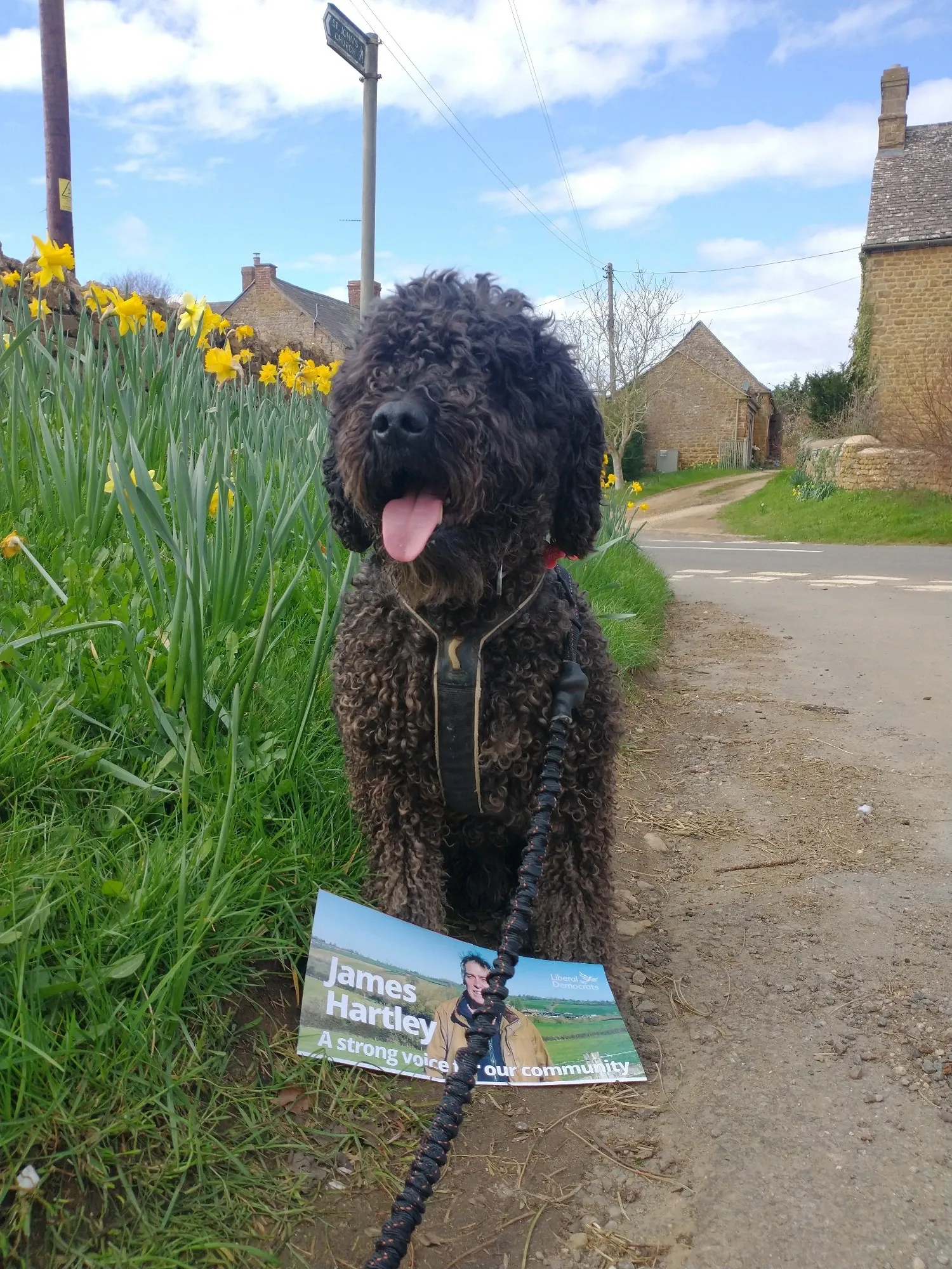 James Hartley (LibDem) is standing in Deddington. This is Hedrig the Spanish Water Dog who has been helping do deliveries all over North Oxfordshire. (But mainly Deddington.) He is a regular feature of James’ Bluesky channel, where apparently he likes ponds mid-delivery.