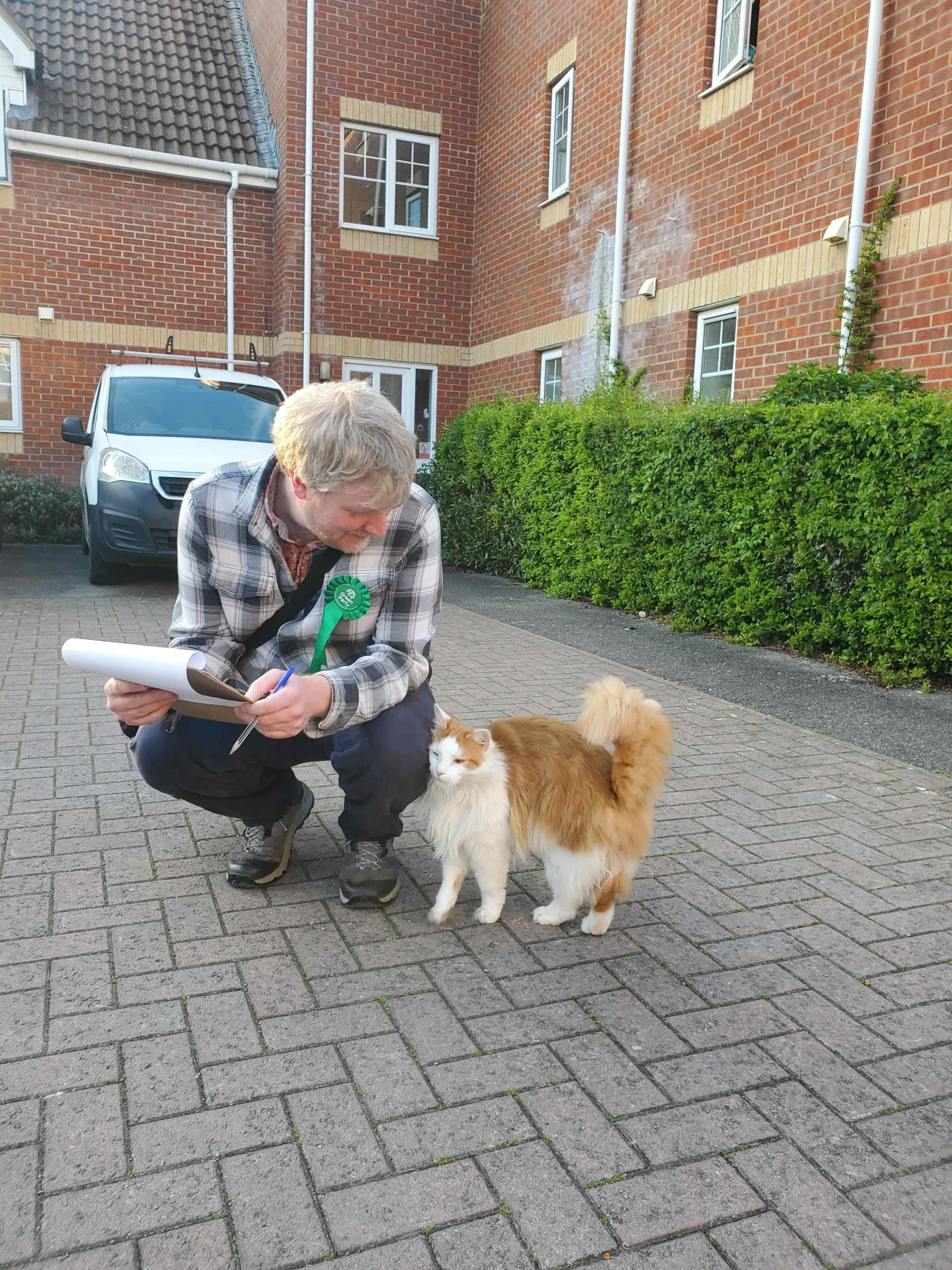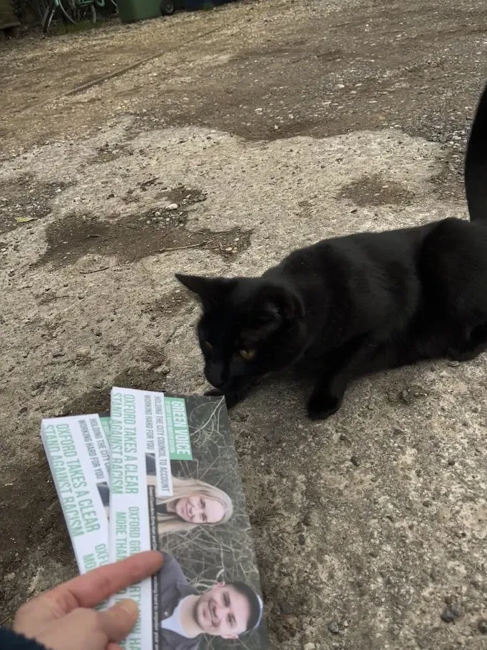 Speaking of Lye Valley, this cat in Lye Valley seems most interested in what James has to say, and would apparently vote Green, if cats could vote. Which they can't. So that's one cat for Labour and one cat for the Greens in Lye Valley. We need a (Kit?) cat bar chart, clearly.