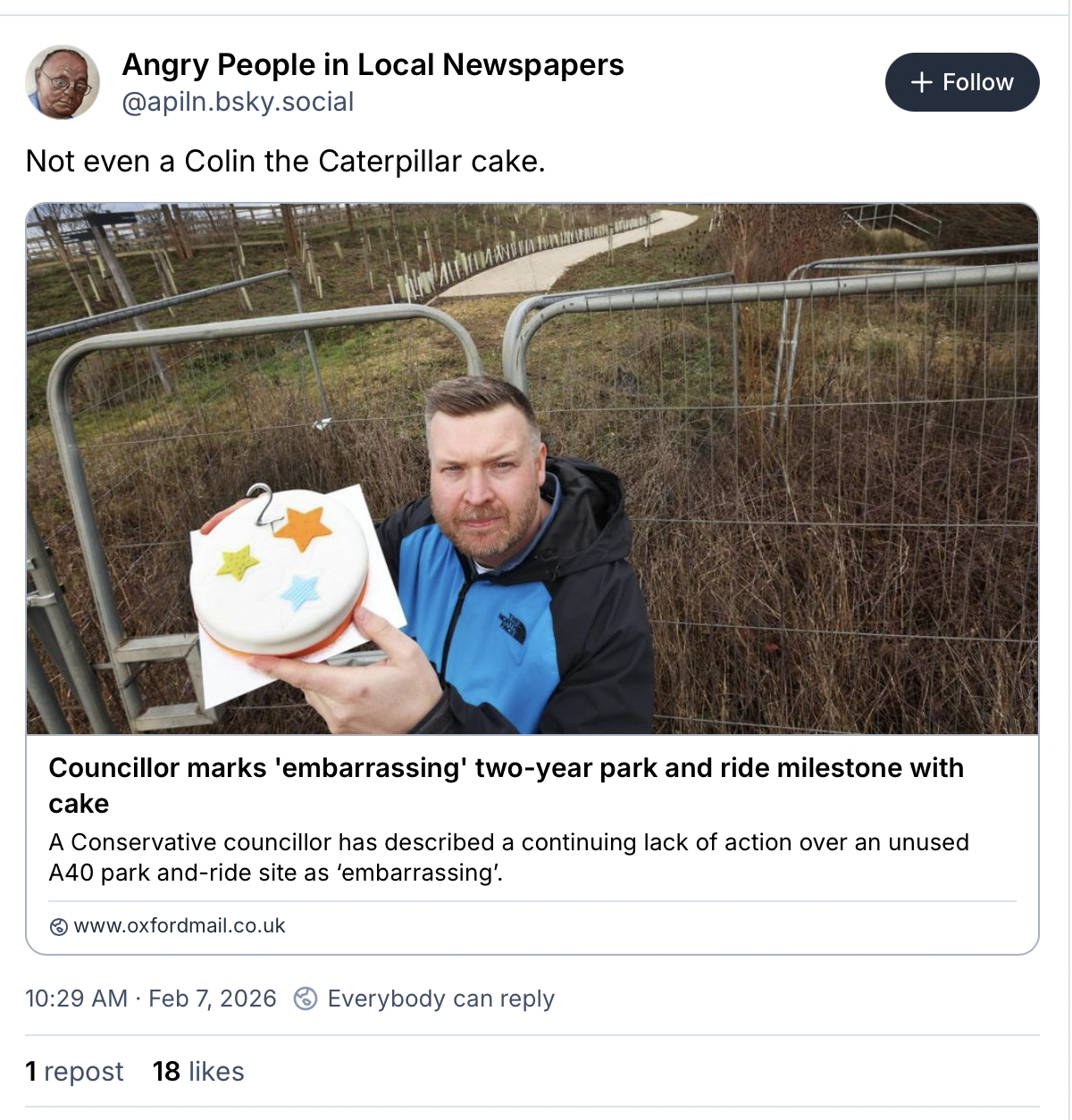 - Henley & Thame MP Freddie van Mierlo has been in Fight Mode this week. First is a genuinely extraordinary letter to the leader of the Green Group on the County Council, after they called for cancellation of the Watlington Relief Road; he says they campaigned in support of it in 2025. (Tl;dr: traffic hotspot, more homes coming, very expensive road, environmentally sensitive area. We wrote a longer version here.) He thinks Andrew Mountbatten-Windsor should be removed from the line of succession, and is demanding the Government stop plans to build on Chalgrove Airfield. Unsurprisingly, minister for housing Matthew Pennycook said no. (Our long read on Chalgrove Airfield started with an open mind and ended up with the conclusion it may be the worst place to put a new town in the whole of Oxfordshire.)