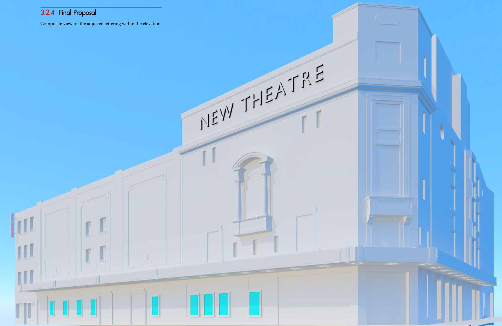 - The New Theatre is proposing to replace its exterior signage and lighting, saying the current lettering is “increasingly ineffective in its primary role as a landmark identifier… the heavy, block-style sans-serif typeface suffers from significant visual distortion from the narrow George Street corridor”. The new signage is based on the typography in the theatre’s 1934 opening souvenir programme, a ‘refined’ version of the then contemporary Gill Sans. The planning application also envisages extending the pavement canopy to run the full length of the building, plus new lighting throughout.