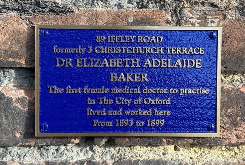 - Oxford’s first female doctor has been commemorated with a plaque at 89 Iffley Rd. Dr Elizabeth Baker was also known for riding a bike given to her by William Morris. The new plaque is on St Hilda’s College accommodation, opposite a plaque to Roger Bannister.