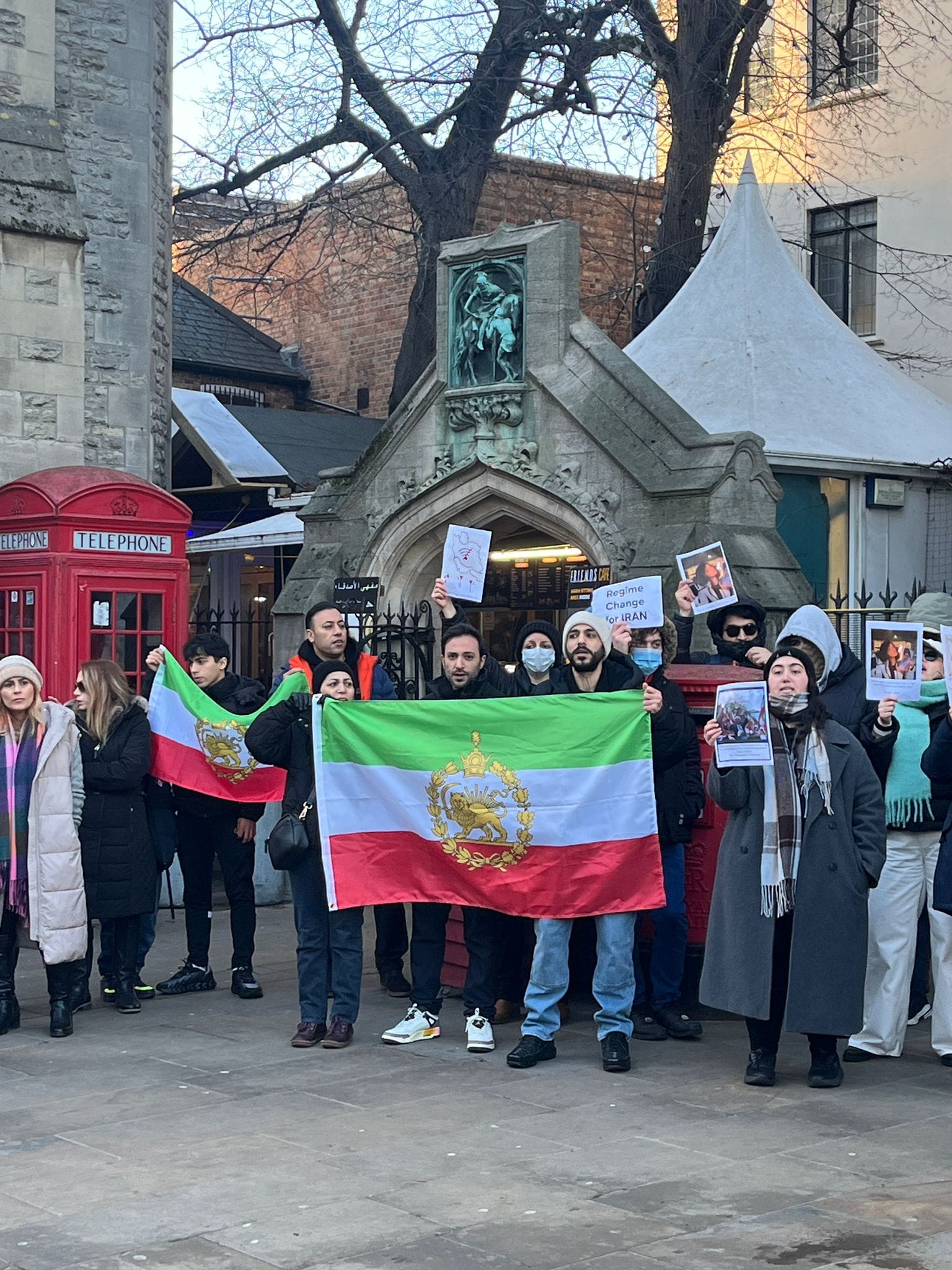 - Protesters gathered at Carfax on Saturday in solidarity with the ongoing anti-government protests in Iran. They were holding Iranian flags with the Lion and Sun emblem, as well as signs demanding regime change, and photographs of the current protests in Iran.