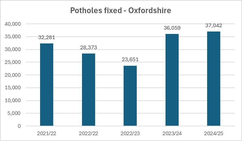 - Pothole news! Oxfordshire is mid-table in a new Department for Transport rating of road maintenance, scoring ‘amber’ overall for Condition and Wider Best Practice, and Green for Spend (meaning it spends more on Capital maintenance than it gets funded from DfT). The ratings are intended to show how effectively national and local funding is being spent. Last financial year, Oxfordshire County Council fixed an estimated 37,042 potholes, the highest number for five years.