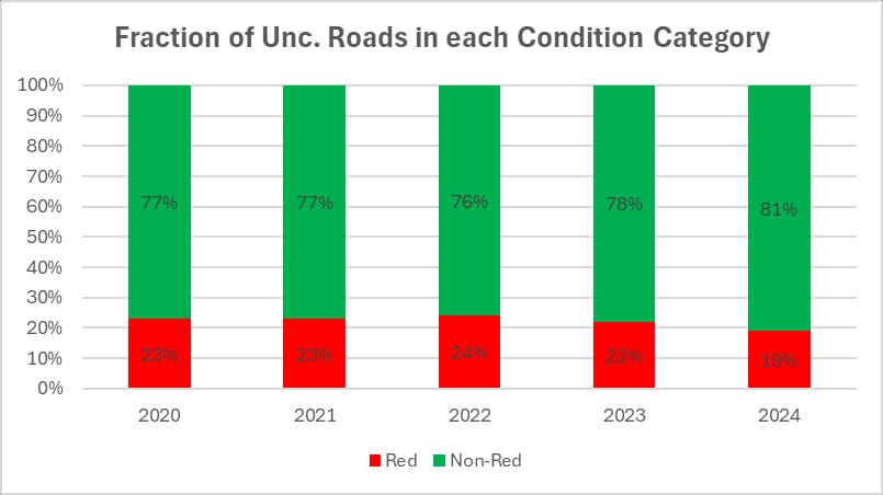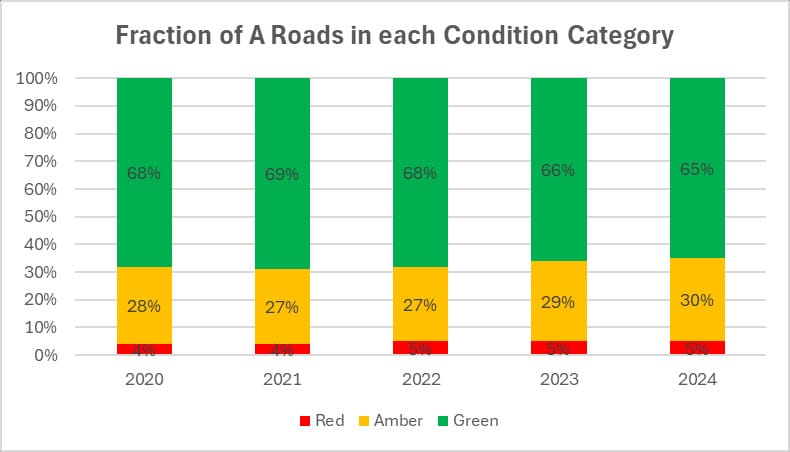 OCC has released its own report showing that it is responsible for 4650km (2900 miles) of roads, 350km (220 miles) of cycleways, and 7450km (4650 miles) of Public Rights of Way. This financial year it will spend £69m on maintenance, but receives only £33m from DfT; most is paid for by general council funds. Delving deeper into the ratings, Oxfordshire now scores highly for preventative maintenance, but its roads are in poor condition and have worsened in recent years. A, B and C road condition has worsened slightly over five years to 2024, while unclassified road condition has improved. (Roads are surveyed every 2-4 years according to category so there is a lag.)