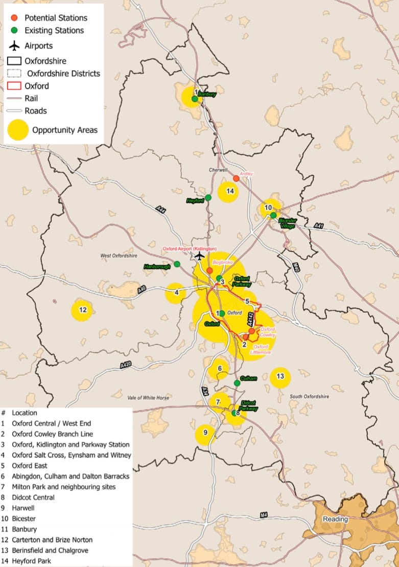 32,000 new homes could be built adjacent to Oxford (with “modest Green Belt releases”) with 50,000 new jobs, plus a similar figure across the rest of the county. These will be clustered in ‘Opportunity Areas’, mostly towns near railway stations. Recommendations include new development around Oxford Parkway and dense town centre housing in Banbury and Didcot.