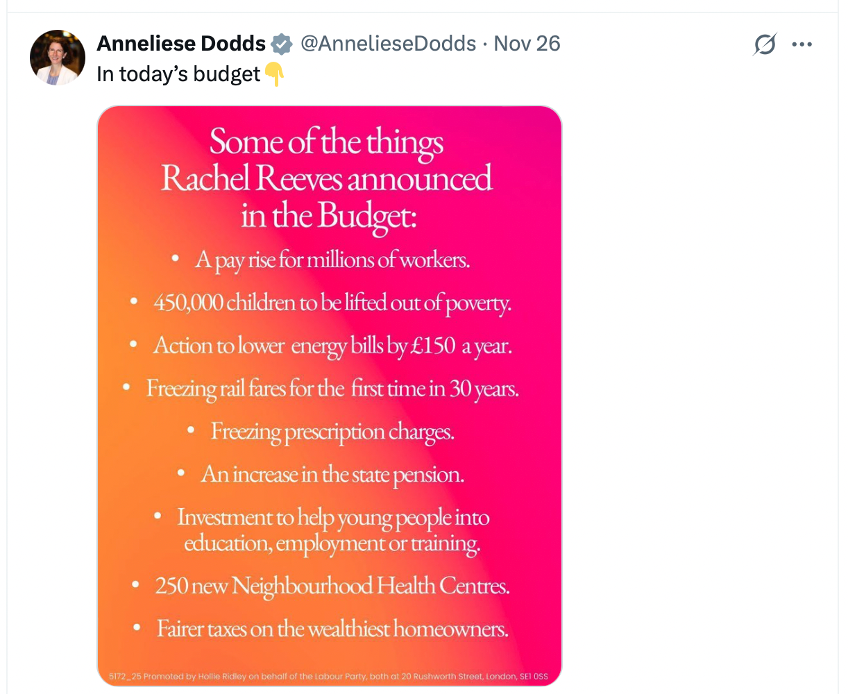 Calum Miller dissects the budget in a five-bleat thread with charts, which is as close as Bluesky gets to PowerPoint: the thrust of his argument is that big banks, digital service companies and online gambling firms, rather than wage earners, should pay their fair share. He was appalled at the pre-budget leak, and held a post-Budget surgery on Thursday for constituents.