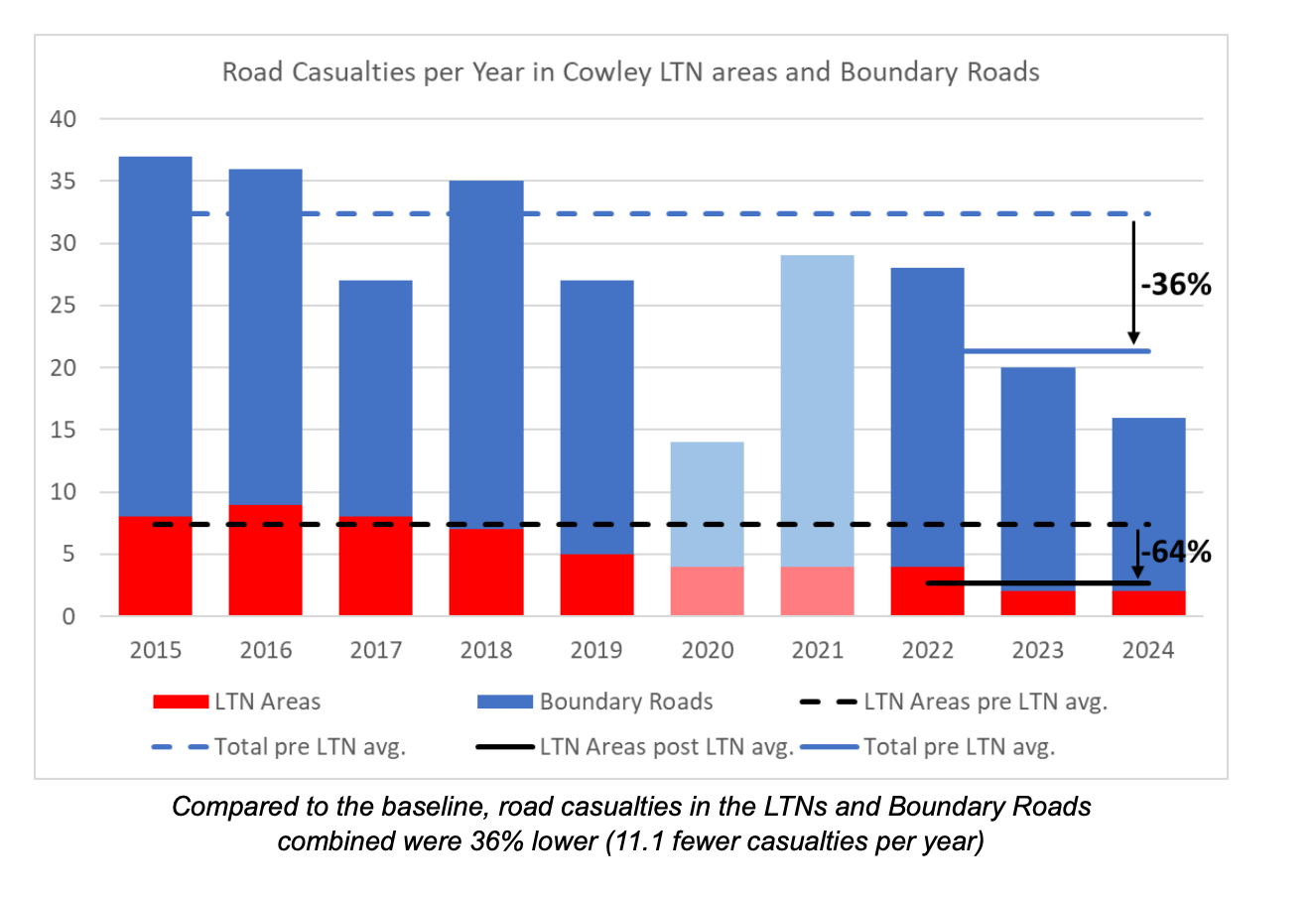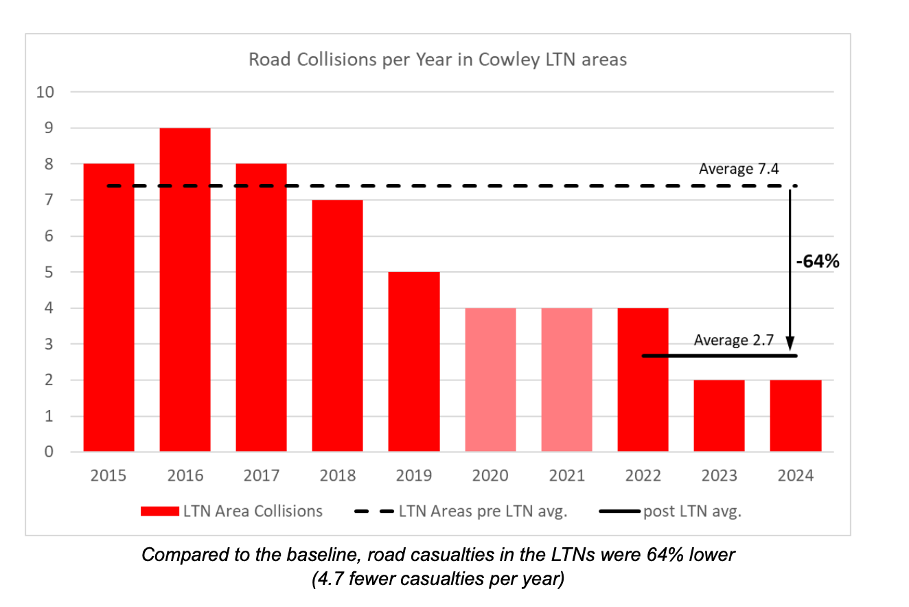 Cowley’s Low Traffic Neighbourhoods have saved 30 collisions over three years, according to the latest casualty data. Oxfordshire’s Coalition for Healthy Streets & Active Travel analysed collision reports both within the LTNs and on the ‘boundary roads’.
