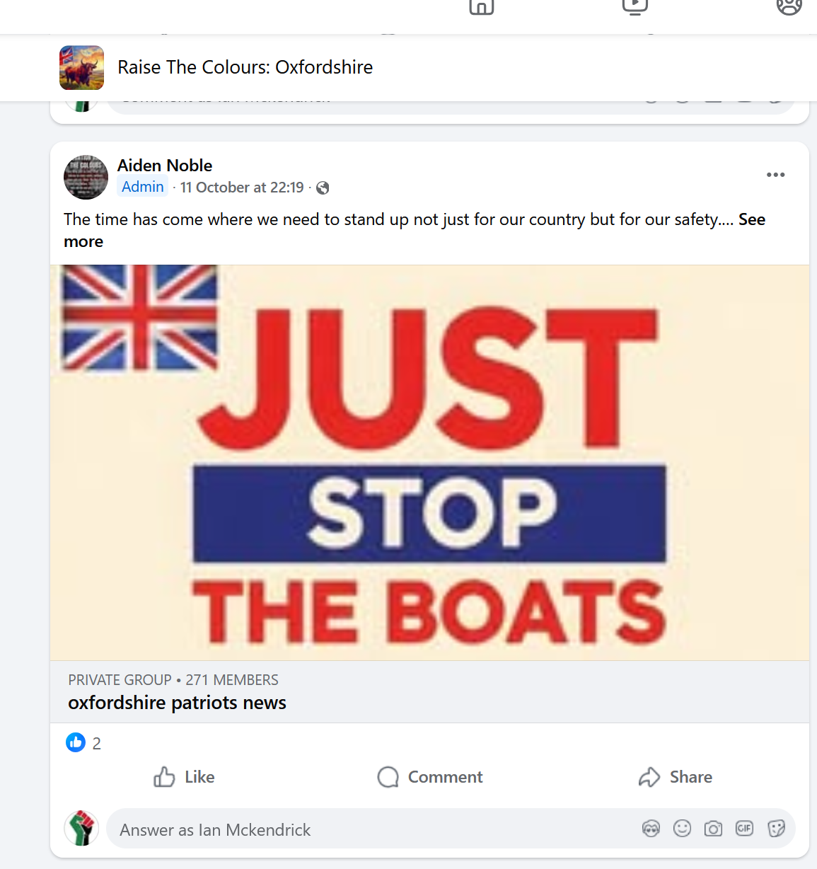 - Three protests converged in Oxford on Saturday, separated by a cordon of 10 police on bicycles and police van. A protest led by the ‘Oxfordshire Patriots’ numbered just 10, with chants including “You can’t leave your child with a lefty”. They carried St George’s Cross, Union and Israeli flags. They shared space on the Martyrs' Memorial in St Giles with a second protest, mounted by around 10 pro-Palestinian protesters, demanding to “stop the genocide”.