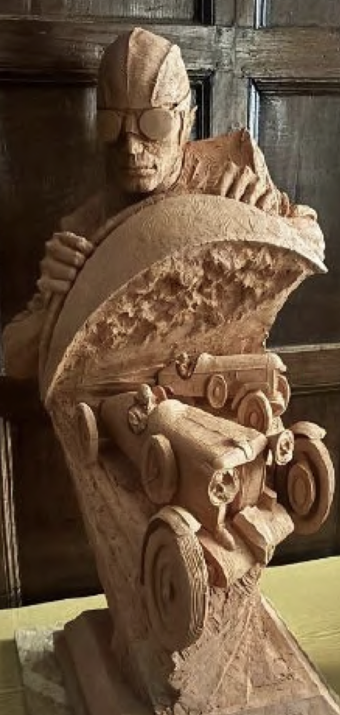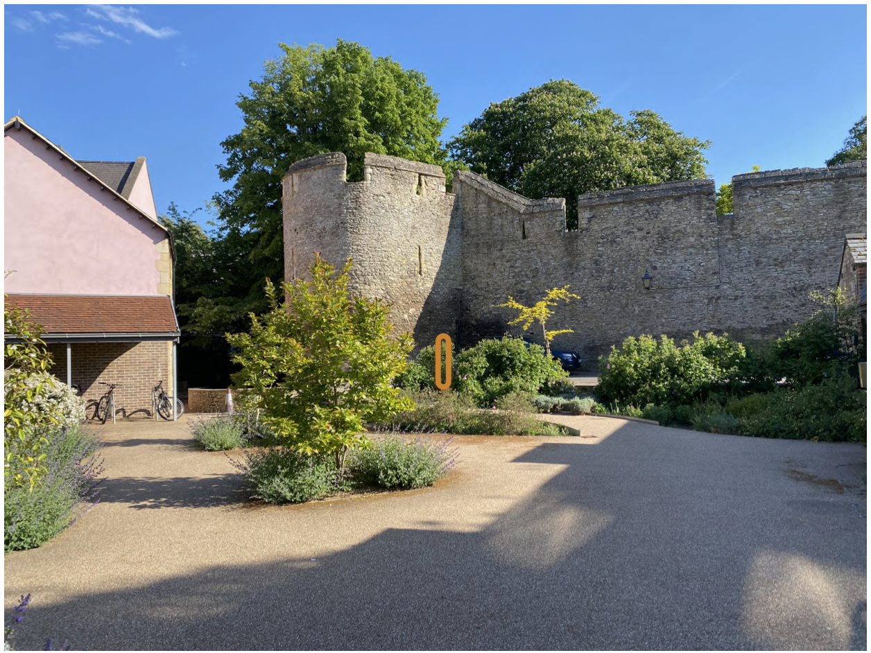 The maquette of the proposed statue of Cecil Kimber (back and front); Morris Garage Quad in New College, together with a mark where the statue would stand.