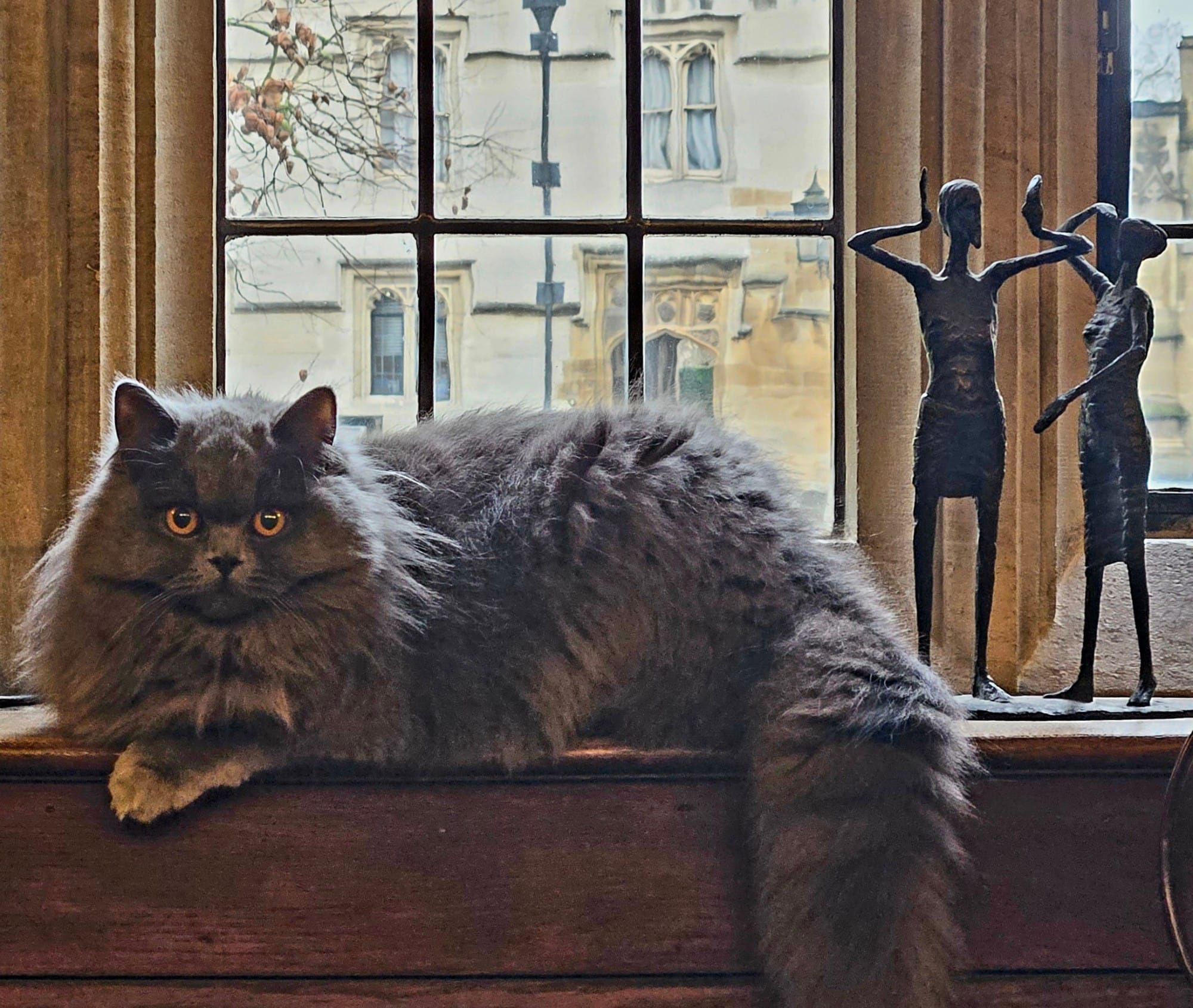 Ozzy is posing with a maquette of David Wynne's Christ and Mary Magdalen: the full-size version is in Chaplain's Quad. Ozymandias photos via Dinah Rose; Geoffrey Biscuit submitted by a follower.