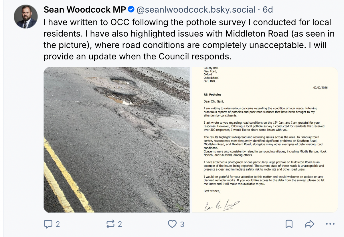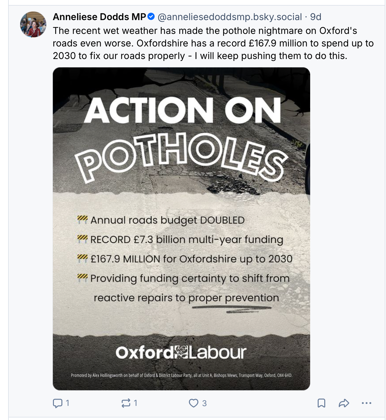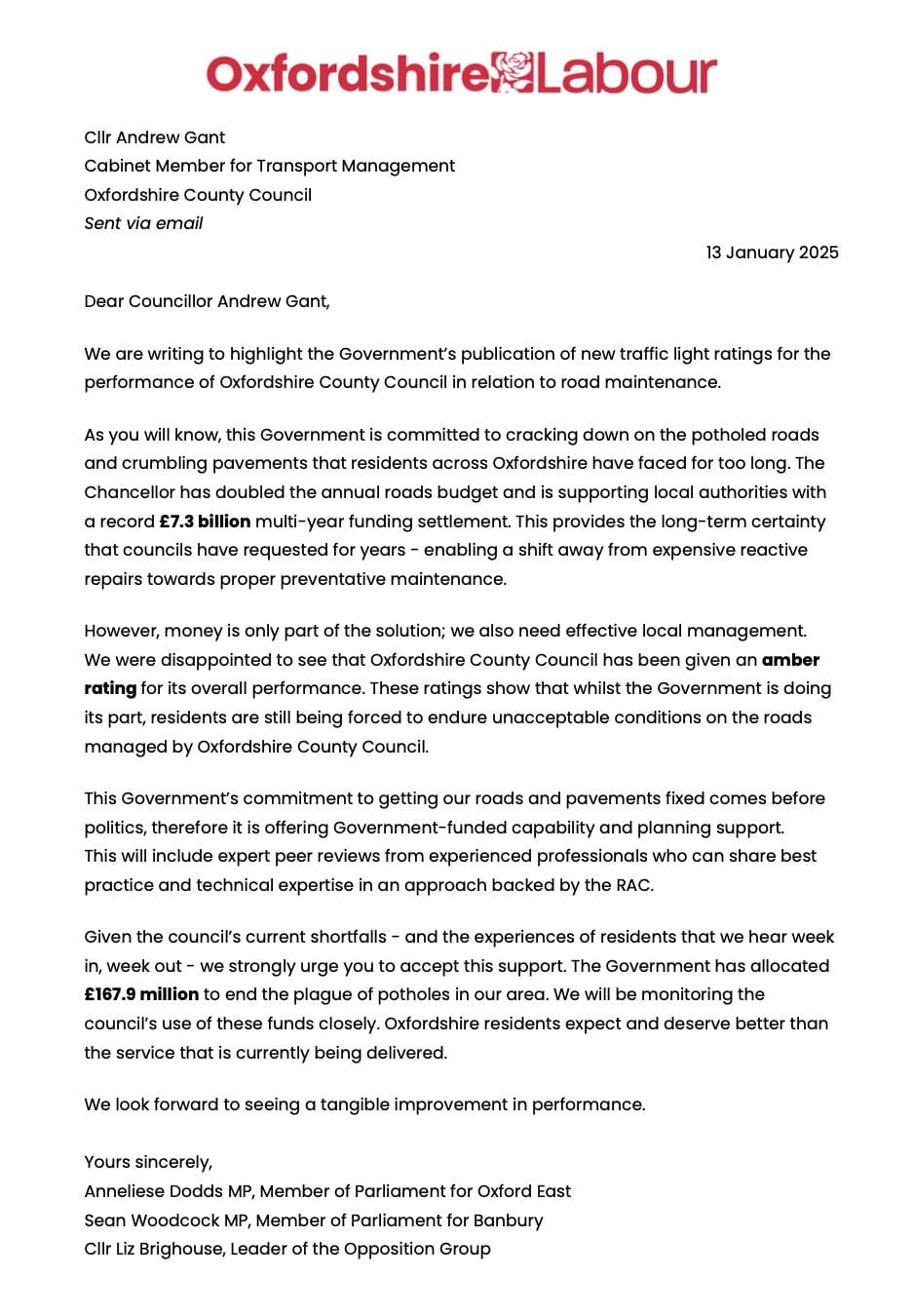 The two Labour MPs, Anneliese Dodds (Oxford East) and Sean Woodcock (Banbury), plus Cllr Liz Brighouse as the leader of the Labour group on the County Council, immediately wrote to OCC’s cabinet member for highways, Cllr Andrew Gant, to challenge the county council on its 'amber rating' and demand more action on potholes.