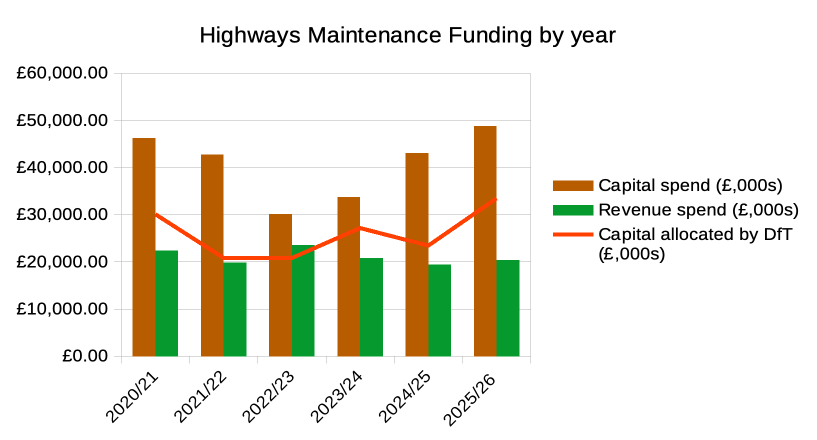 Oxfordshire consistently spends more than it is given by the Department of Transport on capital road maintenance (the brown bars vs the red line). Revenue spend has been about level. In the last two years, in particular, OCC has used this money to increase the number of potholes fixed.