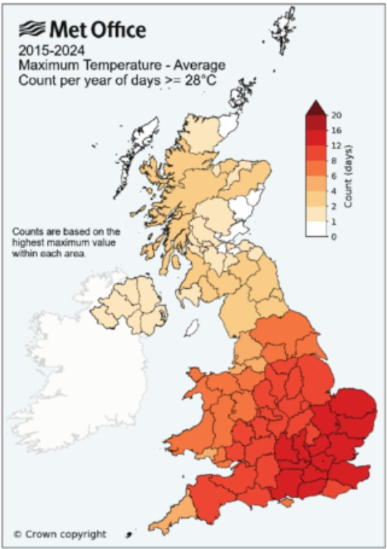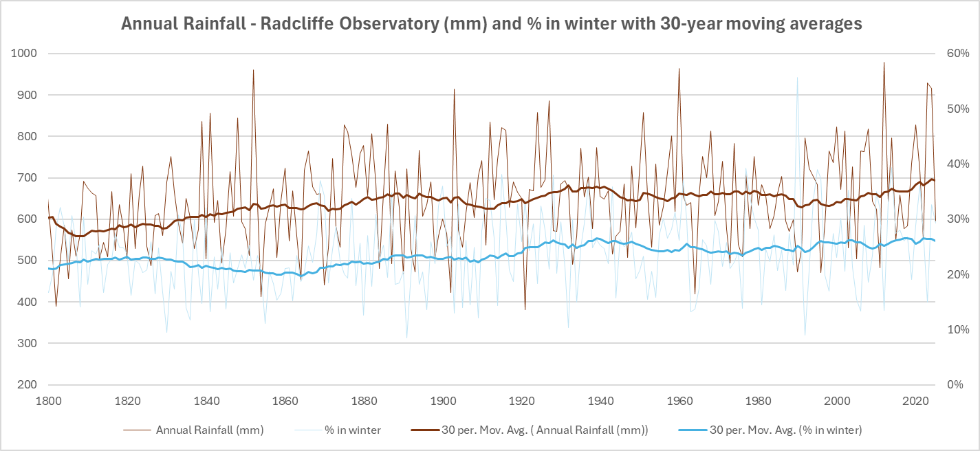 Despite our childhood memories of long, hot summers, in the ’60s, ’70s and ’80s, Britain only averaged five days a year above 28°C. Since 2015, it has been more than 12 days a year. Rainfall levels have been increasing too. Since the 1970s, annual rainfall at Oxford's own weather station has risen from 665mm to 700mm, and the fraction that falls in winter has been rising too.