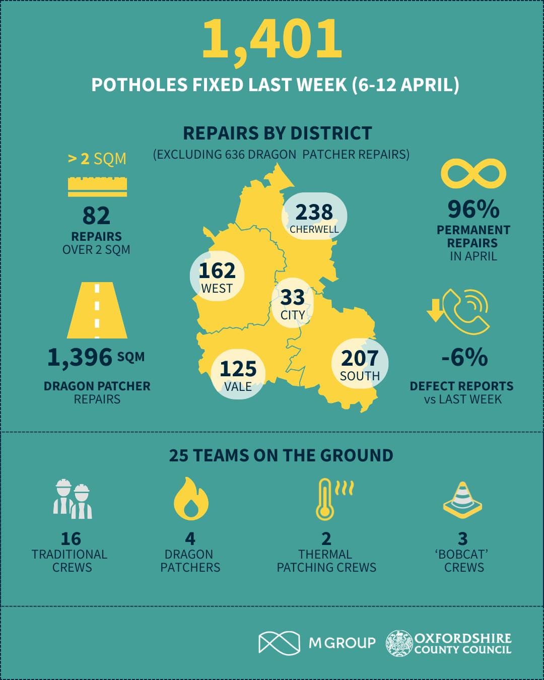 Oxfordshire County Council looks after some 4,500km of roads (2,800 miles) – a mix of A, B, C, and unclassified roads, around half of them being rural. Every road in Oxfordshire is OCC’s responsibility except about 80km (50 miles) of the M40, A34 and A43: those three are National Highways. The county also manages bridleways, byways, footways and cycleways, and potholes can form there too.