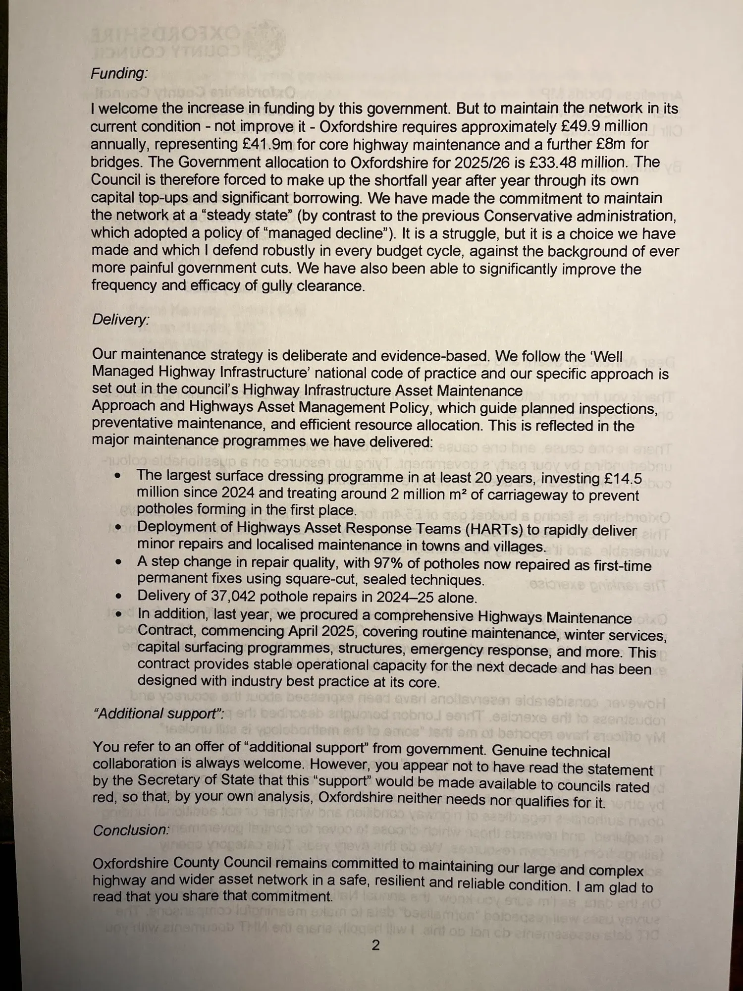 “Oxfordshire requires approximately £49.9m annually, representing £41.9m for core highway maintenance and a further £8m for bridges. The Government allocation to Oxfordshire for 2025/26 is £33.48 million. The Council is therefore forced to make up the shortfall year after year through its own capital top-ups and significant borrowing.”