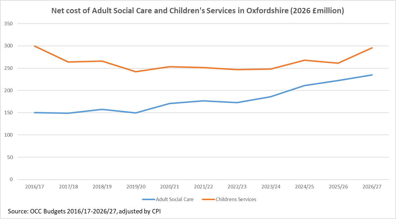 These costs have been increasing and they are statutory, not optional. Adult social care costs have risen by £85m in real terms over the 11 years that we reviewed the budget papers for. Children's services have ballooned by £54m since 2019/20 – not coincidentally, the year before the Covid-19 pandemic. (We adjusted these figures for inflation to ‘2026 pounds’.)