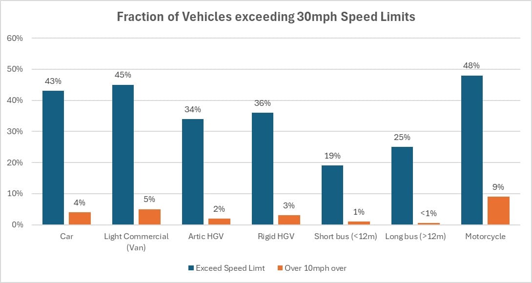 The data is from October 2023 and collected from telematics built in to the vehicles, but aggregated in an anonymised process to be non-identifiable. While the source means this data is purely from HGVs and LGVs, that is not because they are a particular speeding problem: van drivers speed slightly more than car drivers, but motorcyclists as a group speed most often. HGV drivers speed less often, though more than bus drivers. Still, if goods vehicle drivers are breaking the speed limit, it is a pretty good indication that other drivers will be too.